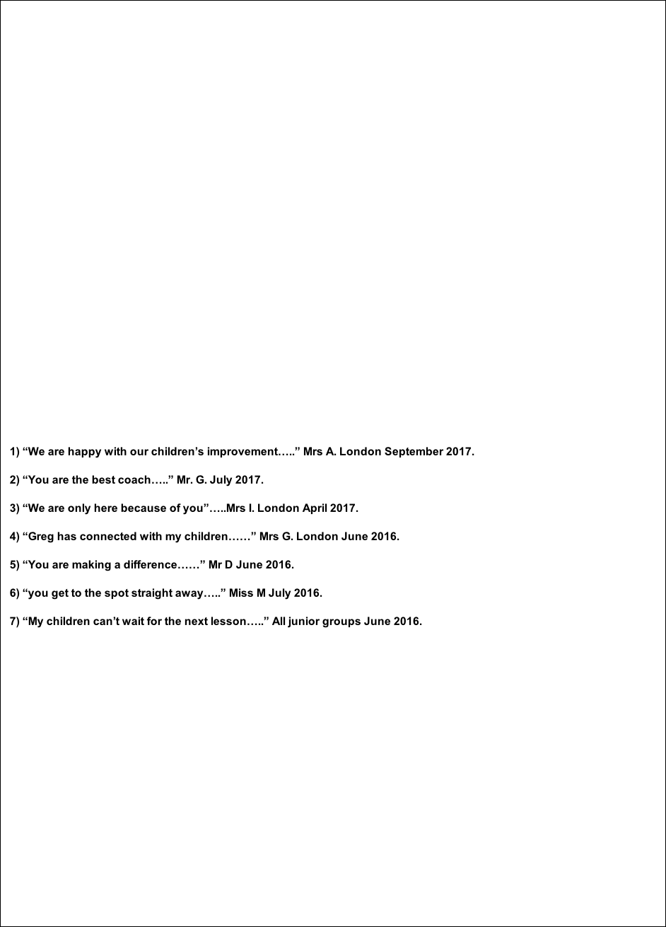 8) “Greg has developed an interest in tennis in my children. My four year old in particular is keen and likes to rally. Whilst we have to work on his forehand, his backhand looks very stylish.......” Mrs. Charlie S. London July 2015.